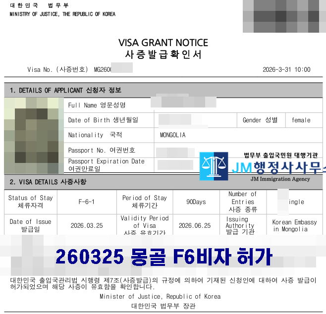 260325 몽골 F6비자 허가